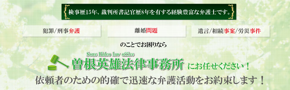 曽根英雄法律事務所のホームページへようこそ! 曽根 英雄弁護士 ホームページを見て依頼されたいとの声が多いことから、本年からホームページをご覧頂いた方のご相談・ご依頼を可能なかぎり受けることにいたしましたのでお知らせいたします。 取扱い専門分野